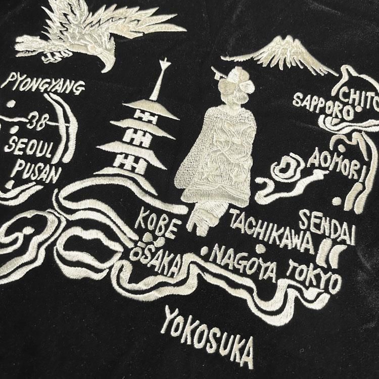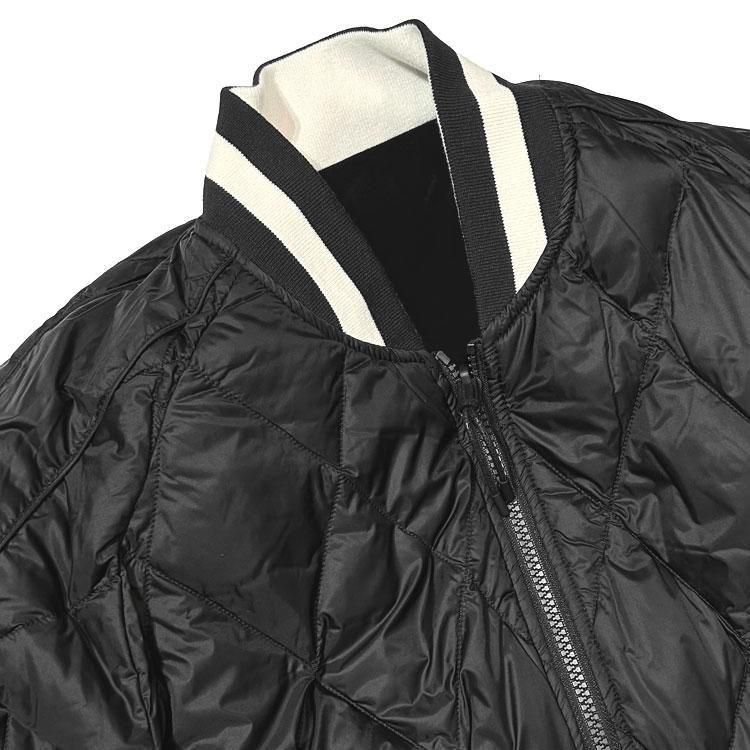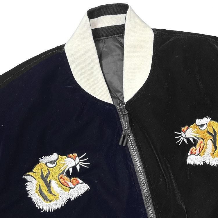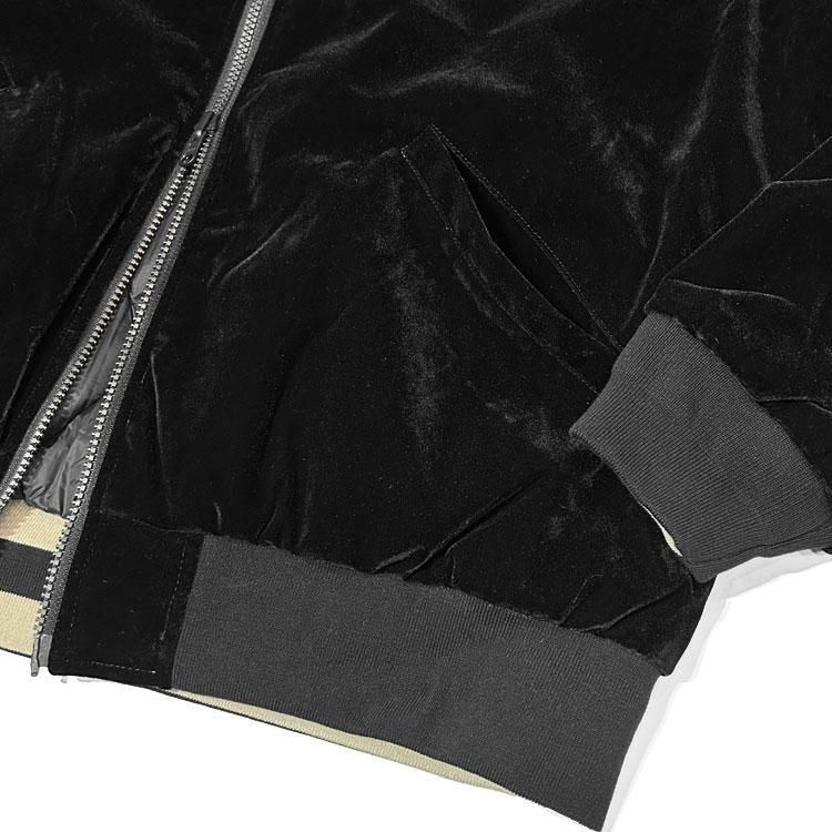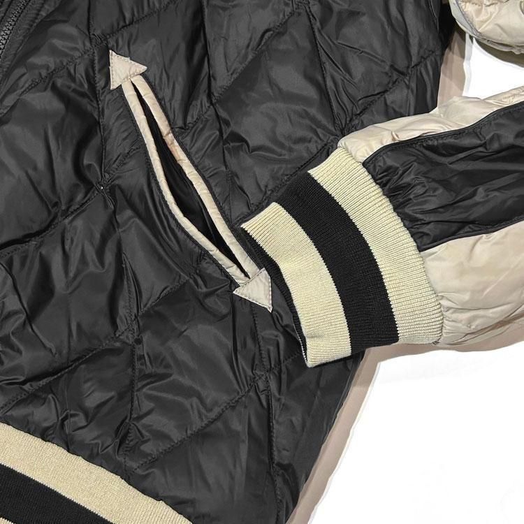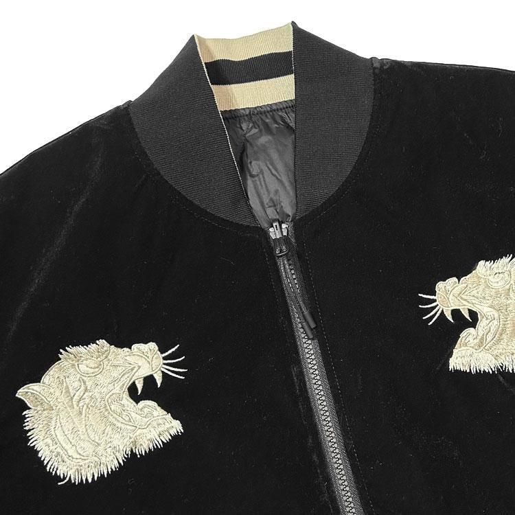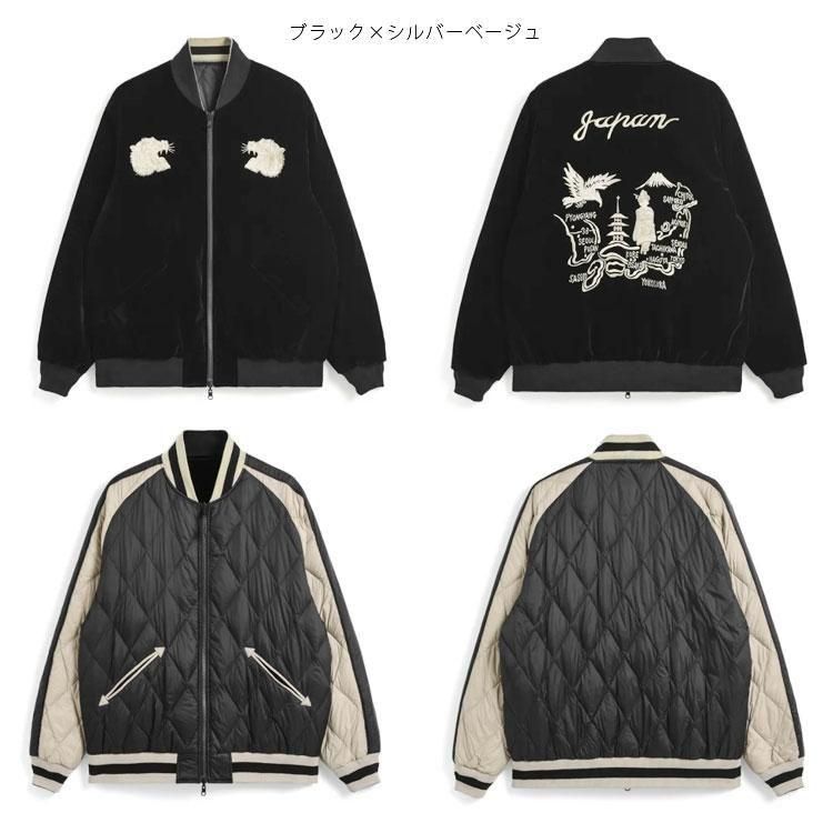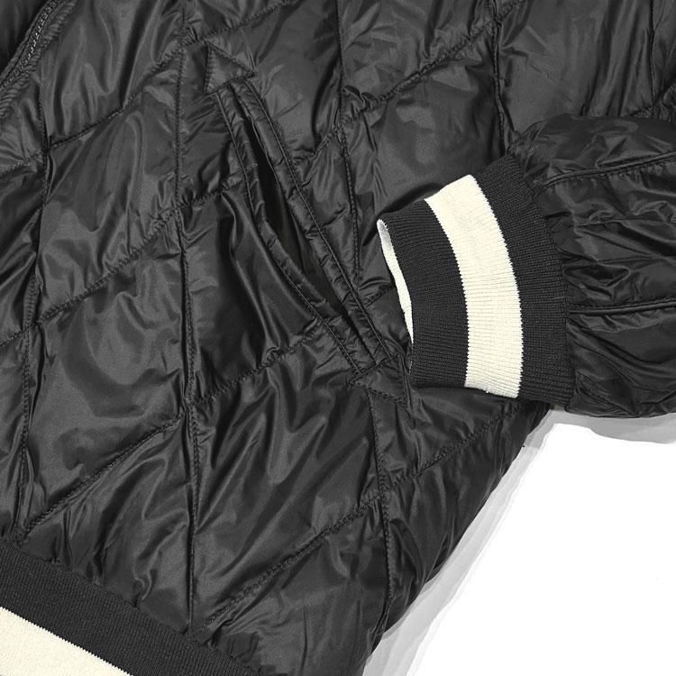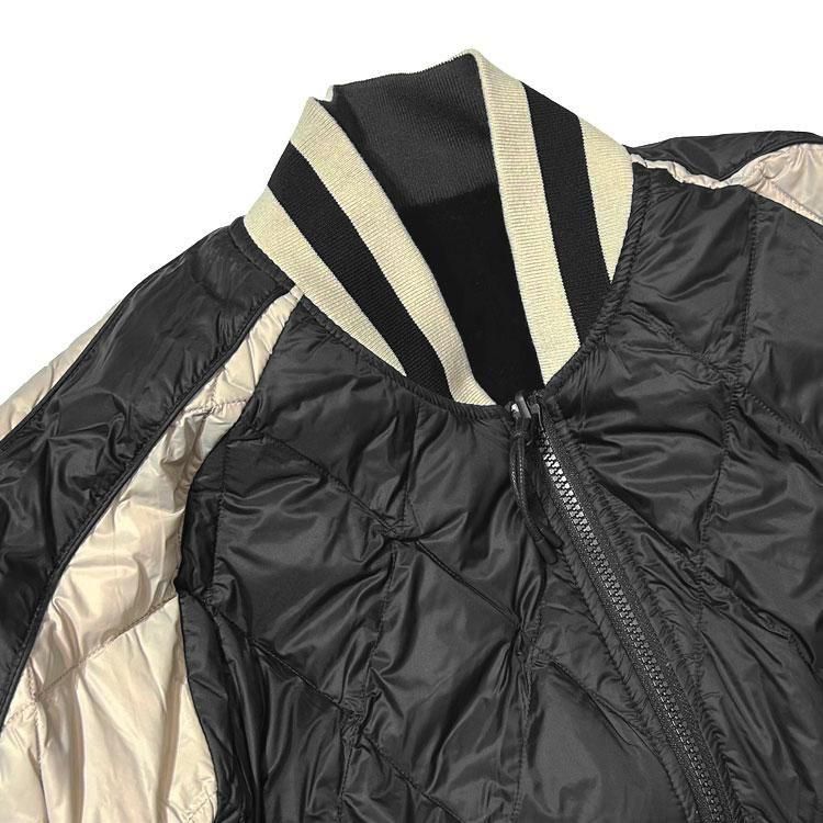 表側は毛羽のあるベロア素材に刺繍があしらわれ、裏側はダイヤ柄のキルティングでミリタリーライクな雰囲気です。