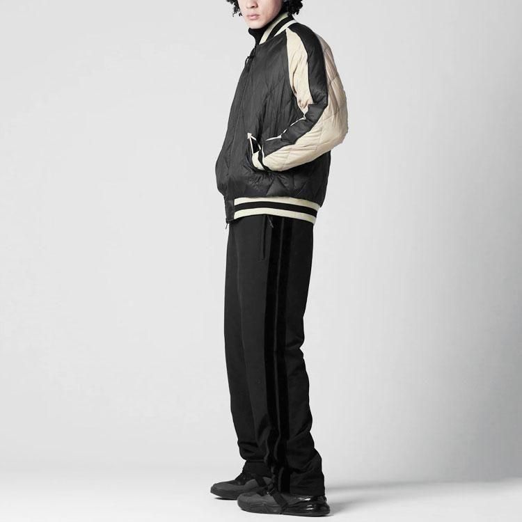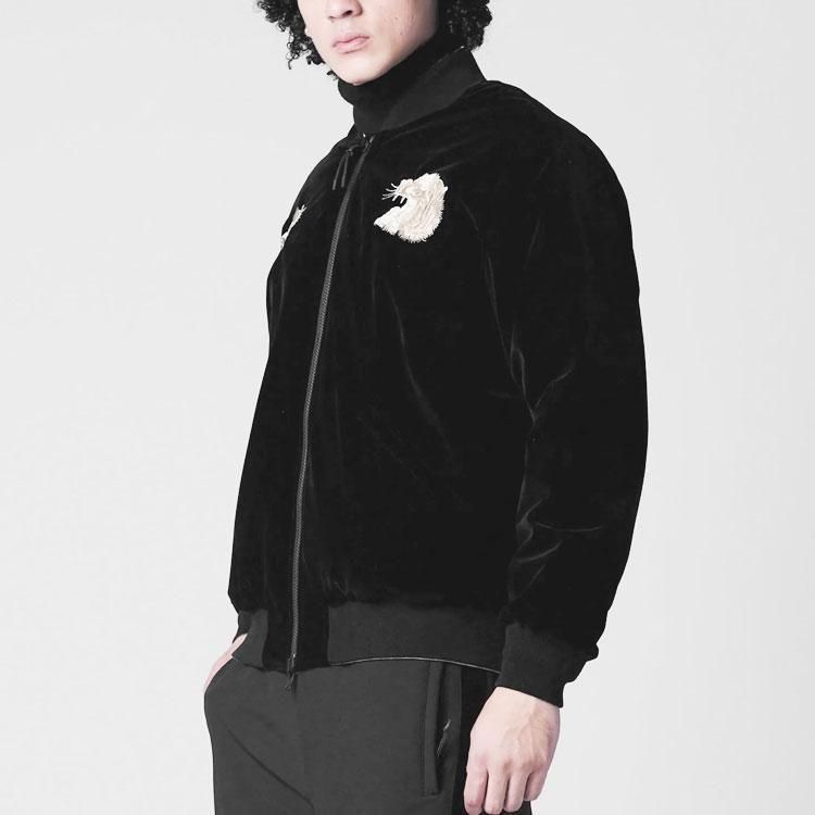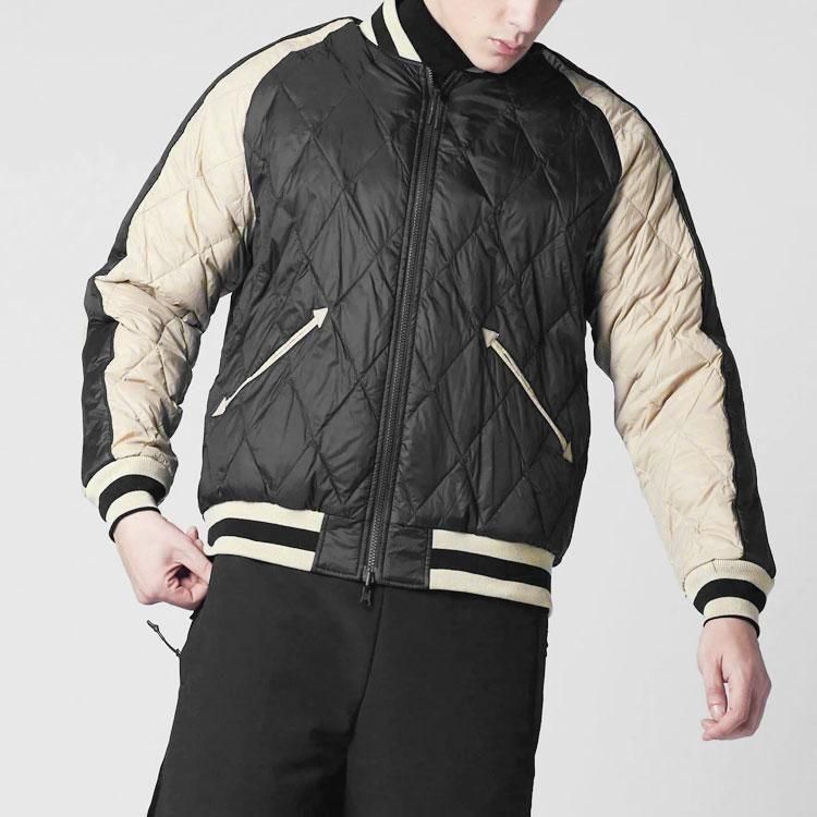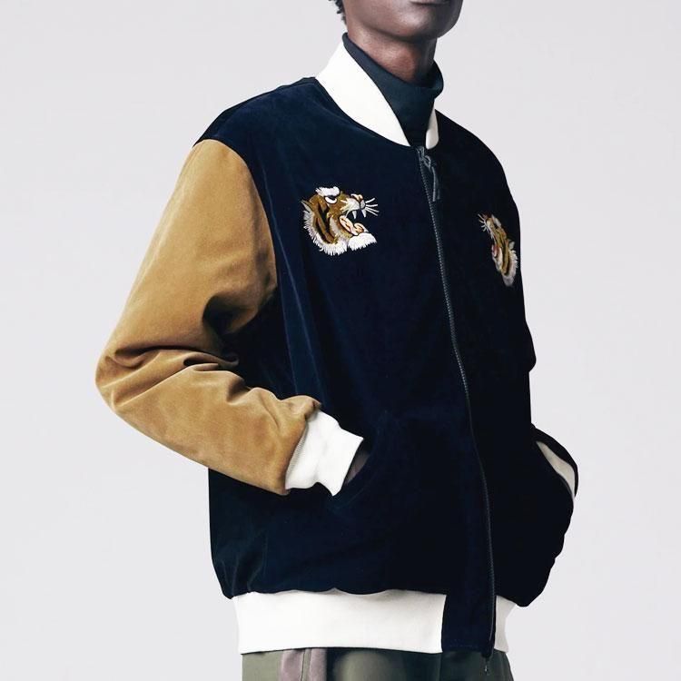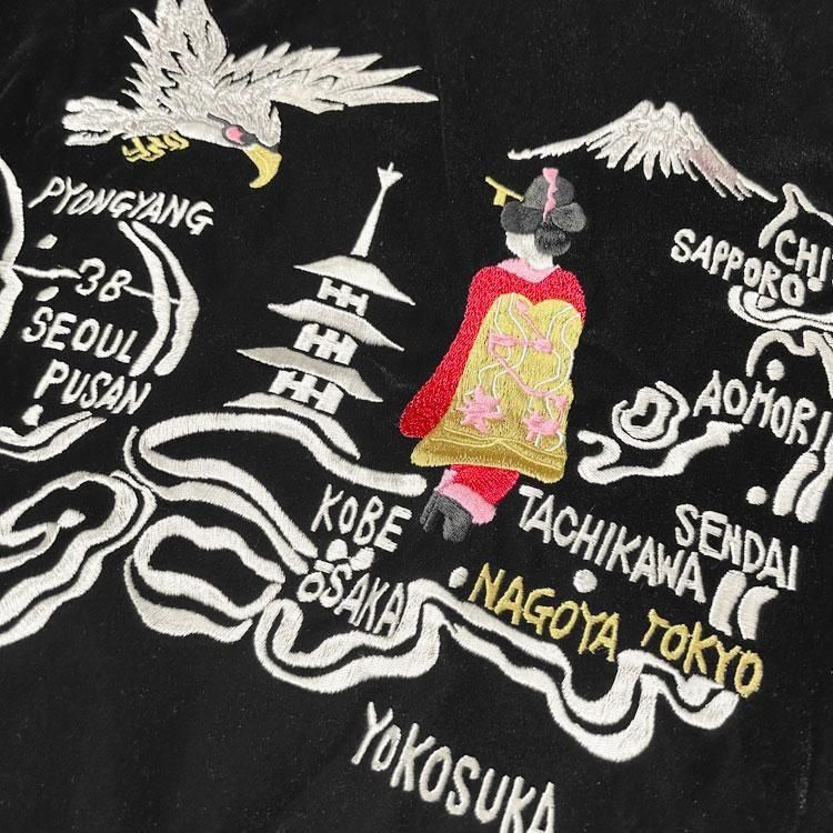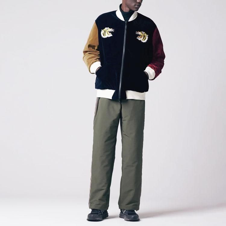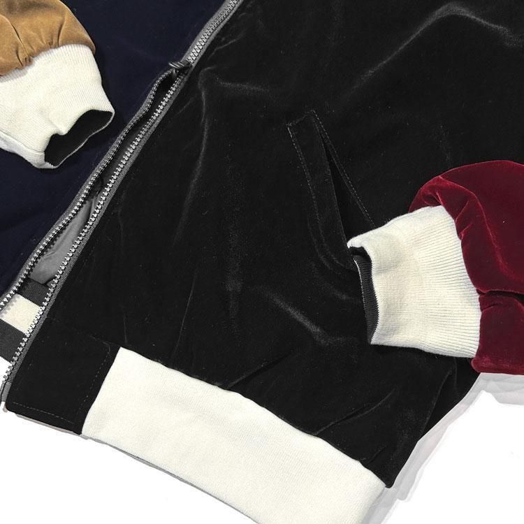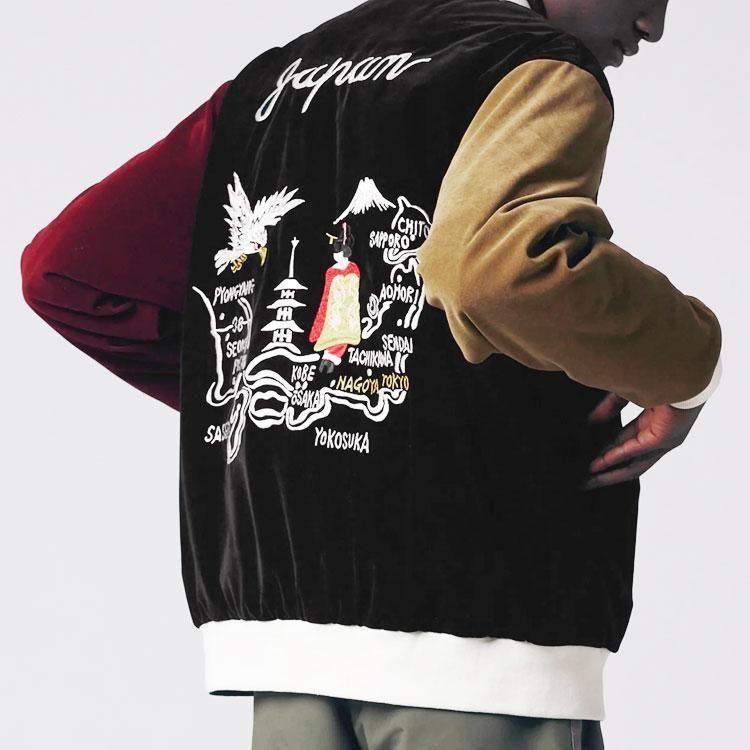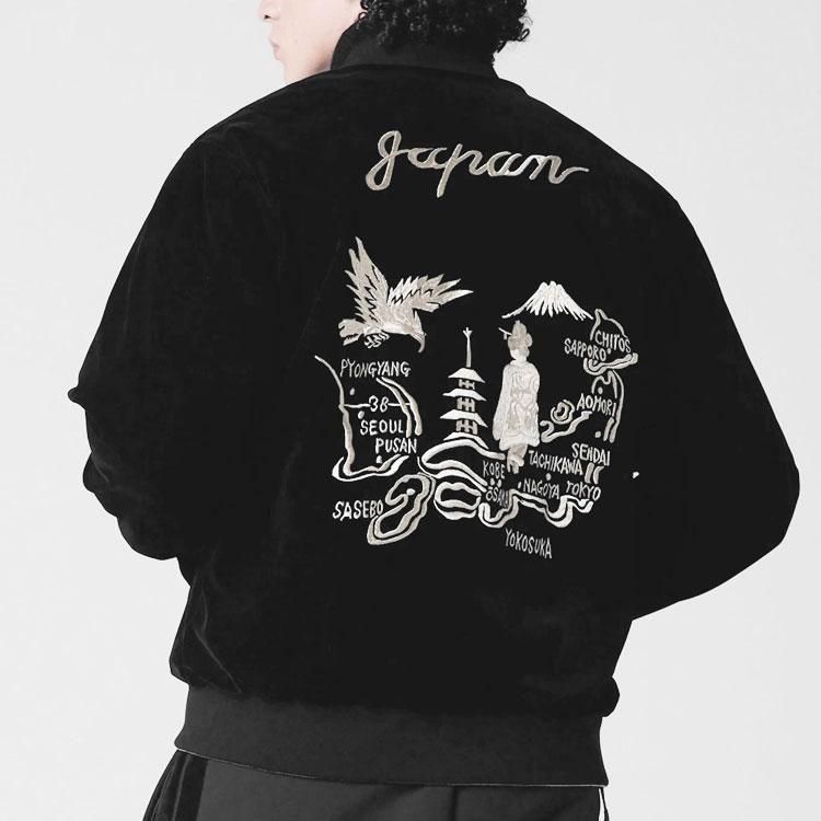 表側は毛羽のあるベロア素材に刺繍があしらわれ、裏側はダイヤ柄のキルティングでミリタリーライクな雰囲気です。