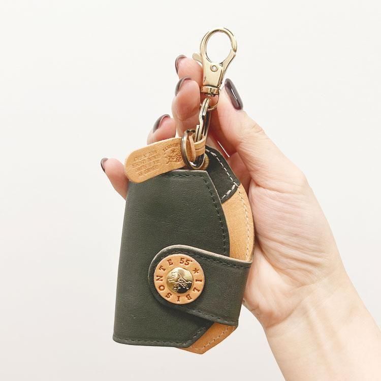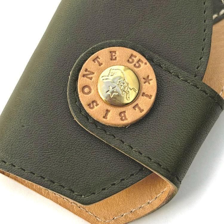 オリーブを思わせる日本初登場カラー「BOSCO(ボスコ)」とヌメのバイカラーで、「55」を刻印したレザーとお馴染みの水牛ボタンを組み合わせたコンビデザインの留め具がアクセントに。
