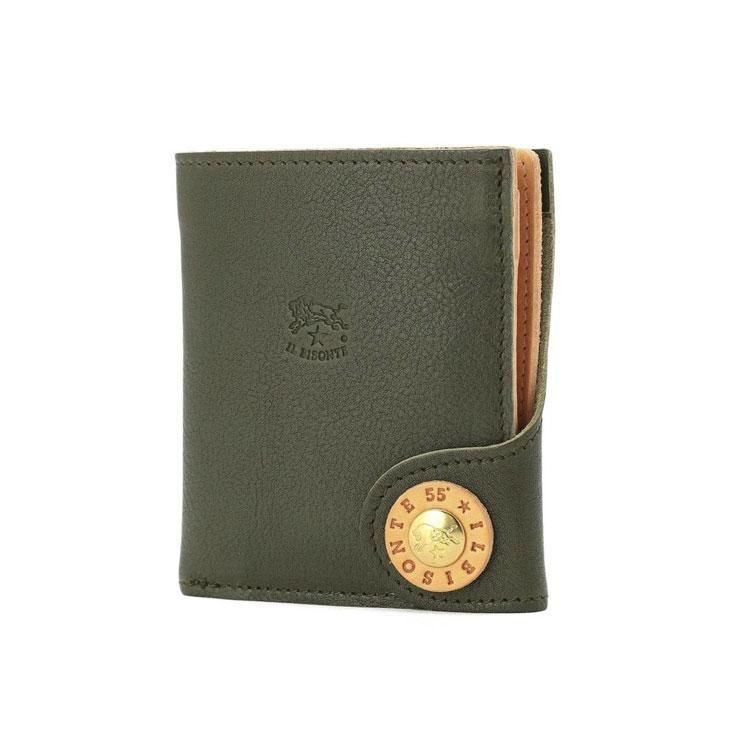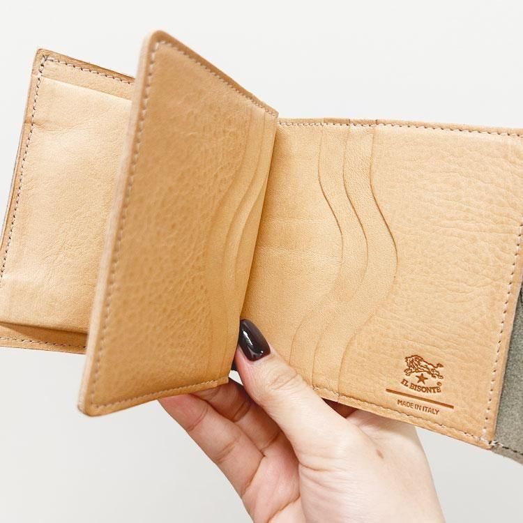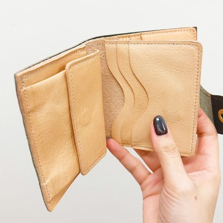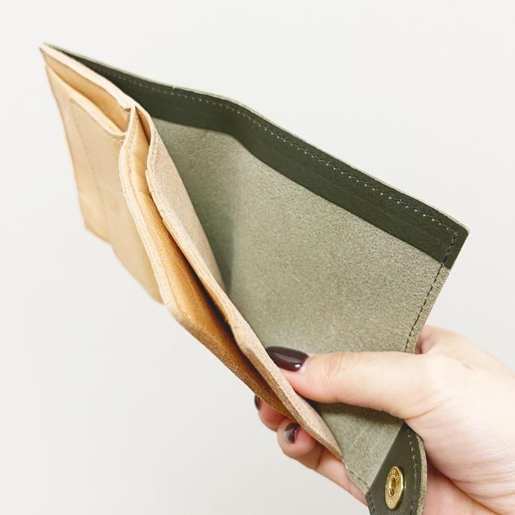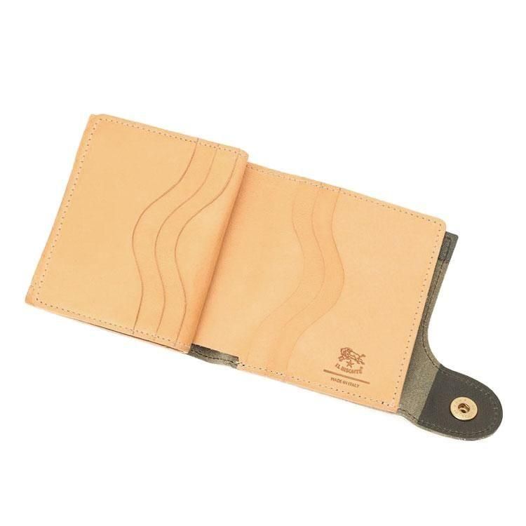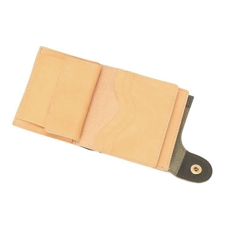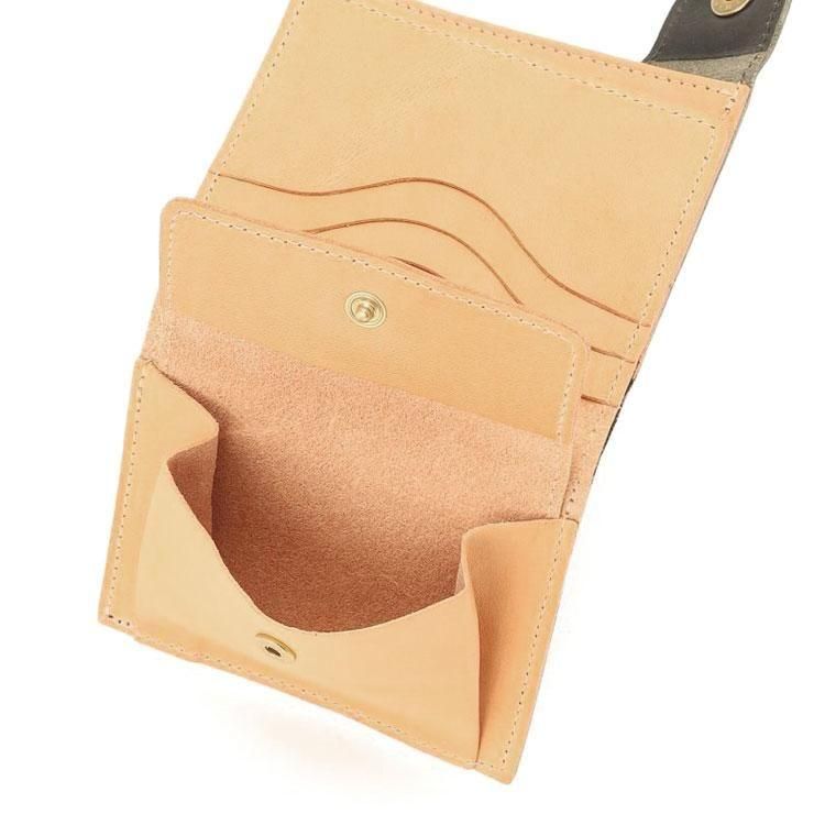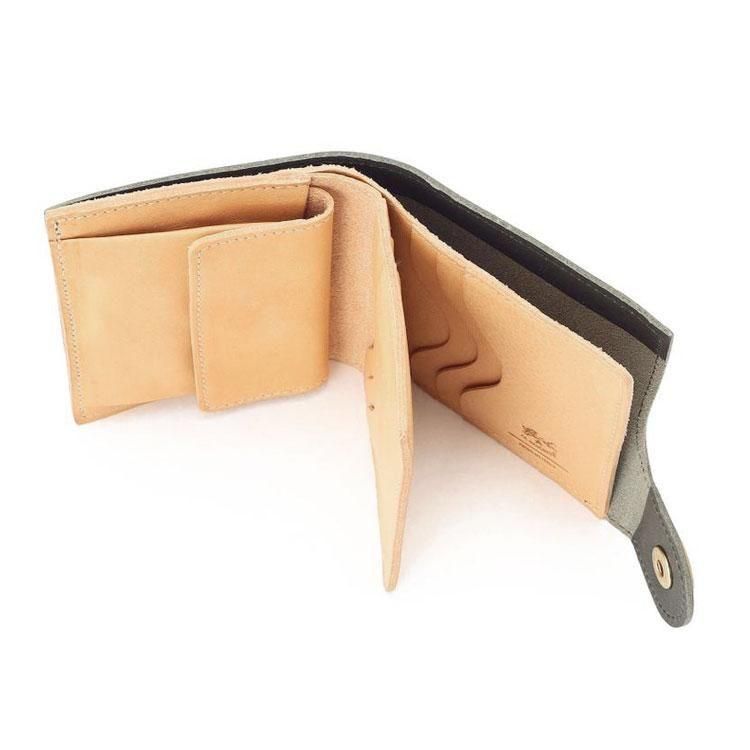 スナップボタンを開けると、出し入れしやすいスリットポケット仕様の札入れ、マチ付きコインポケットと3面のカードホルダーを備えています。