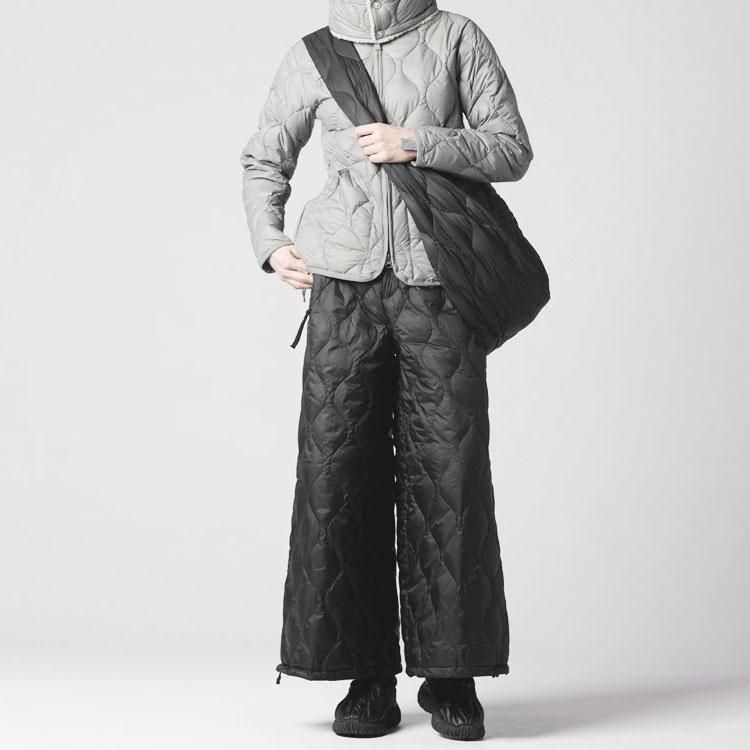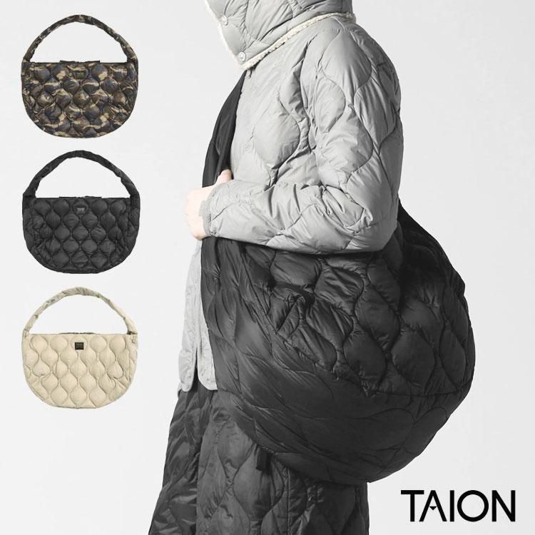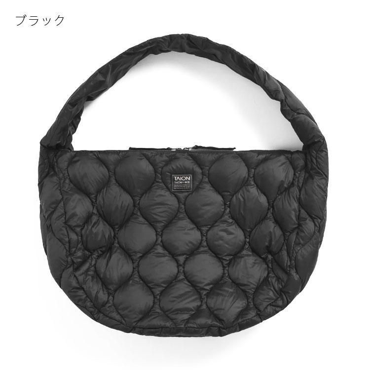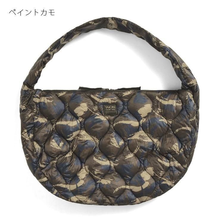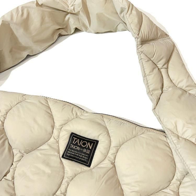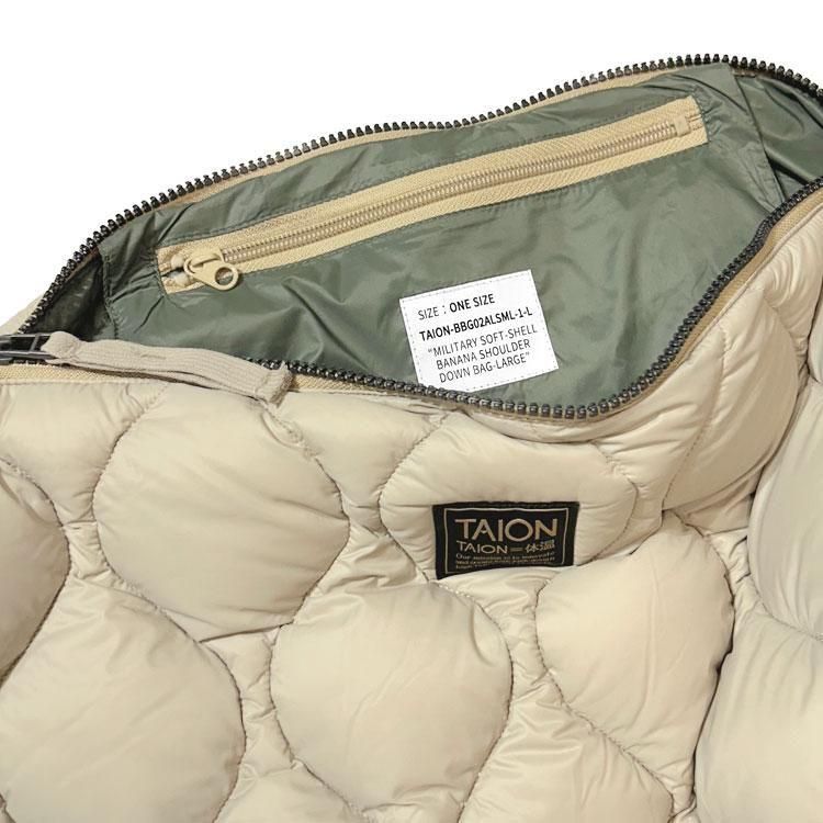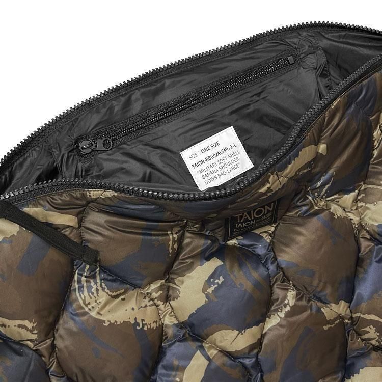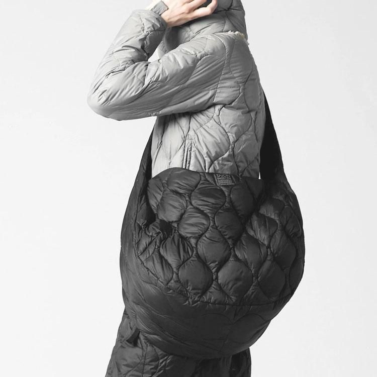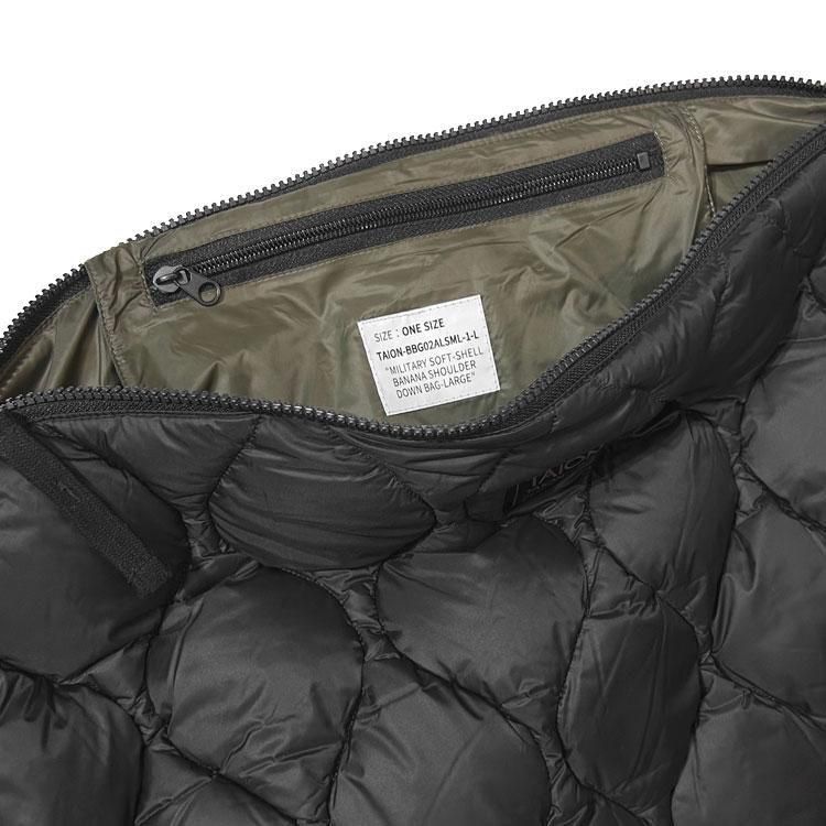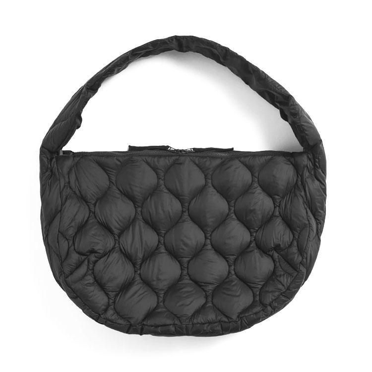 ダウンによるボリューム感が魅力のバナナ型ショルダーバッグ。