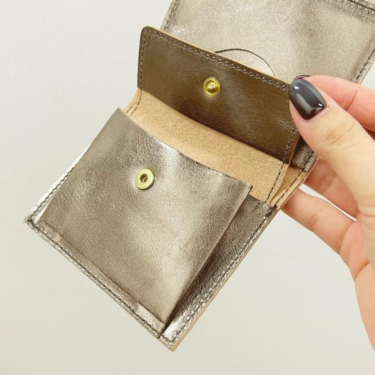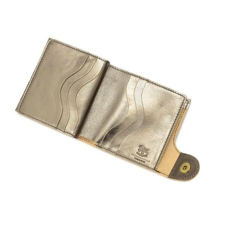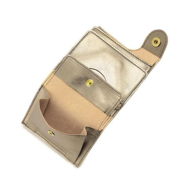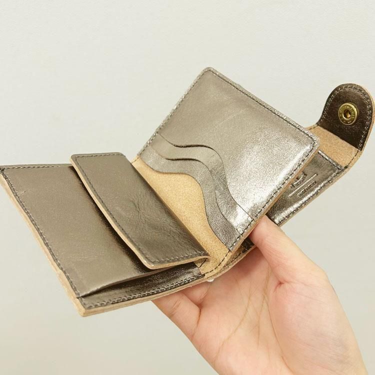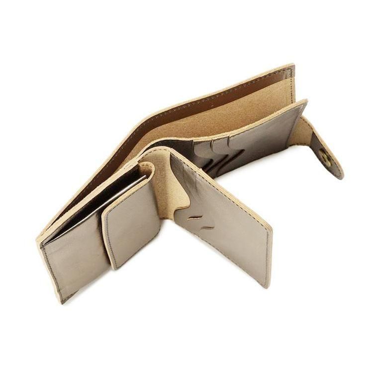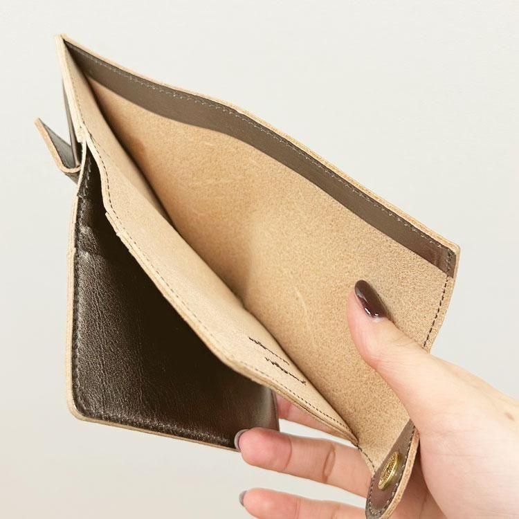 スナップボタンを開けると、出し入れしやすいスリットポケット仕様の札入れ、マチ付きコインポケットと3面のカードホルダーを備えています。